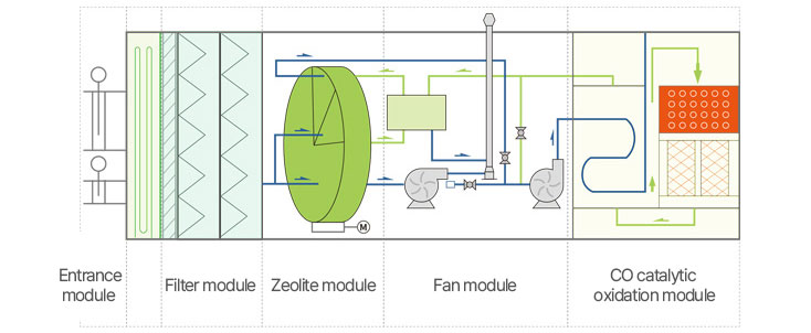 - Using precious metal (Pt, Pd) catalysts, energy consumption is reduced due to low reaction temperature, and the purification efficiency is over 95%, which reduces investment costs.