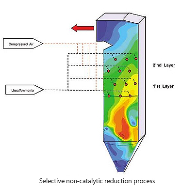 Selective Non-catalytic Reduction Technology is a technology used to remove nitrogen oxide by directly spraying the reducing agent onto the side of the furnace which has an exhaust gas of high temperature range (850 ¡É ~ 1,050 ¡É) or into the duct, and the required NOx removal efficiency is expected to be achieved by spraying the reducing agent at an optimal temperature range. Selection of the reducing agent injection nozzle location is an important design factor for performance warranty.
