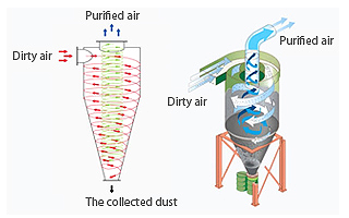 A Cyclone is equipment which structurally removes dust using the principle that, when dust is absorbed into a cone-shaped container, it falls down to the dust storing place by centrifugal force and gravity.