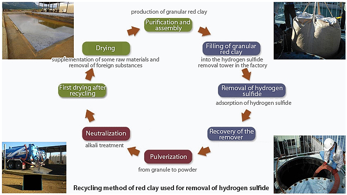 The used desulfurization agent after adsorption should be abandoned or disposed with care as it generates heat or gas when contacting the air. C&G has desulfurization agent recycling technology which is possessed by only one company in Japan (jointly developed by C&G and Kumamoto Agata Industrial Technology Center, the patent is open to public). It is a very environment-friendly technology which can recover all used desulfurization agents as raw materials for desulfurization agent again without throwing them away at all.